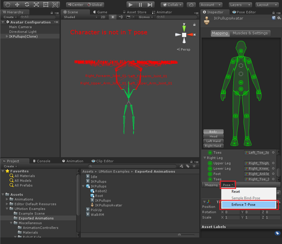 Click on "Pose --> Enforce T-Pose" to automatically bring the character into T-Pose. Manually check if the character really is in a nice T-Pose:- The arms must be fully stretched and held horizontally (T-Shape)